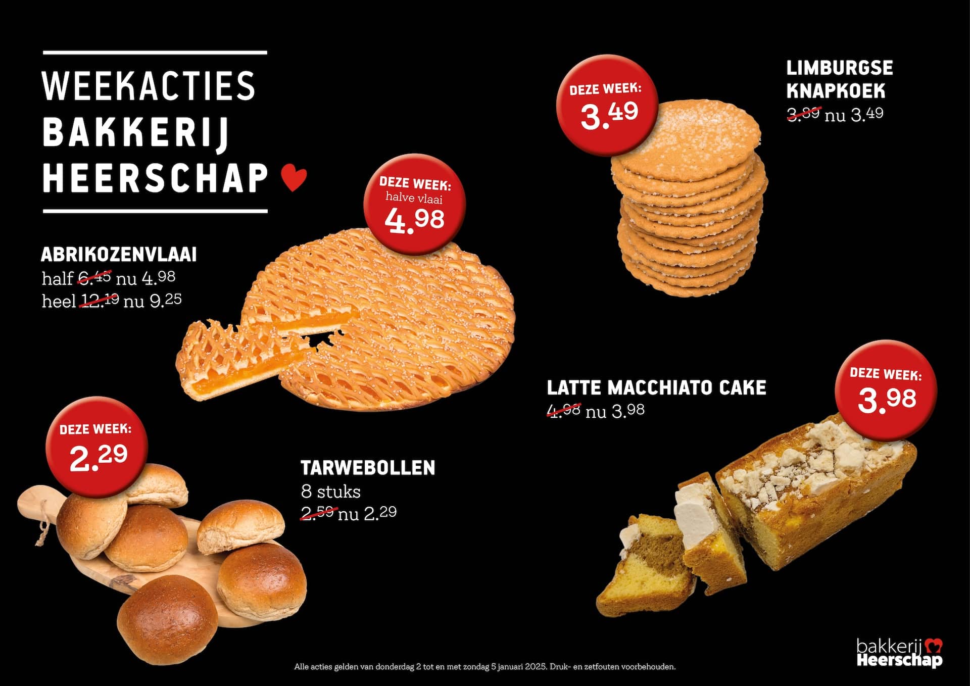 Geniet van versgebakken ambachtelijke broden, de heerlijkste vlaaien en seizoensgebonden producten. Zo vers en zo lekker, dat kiezen een kunst op zich is. De producten van Bakkerij Heerschap worden 365 dagen per jaar met liefde voor je gemaakt en dat proef je! Iedere week selecteren de bakkers nieuwe weekacties voor jou. Welke actie kies jij?