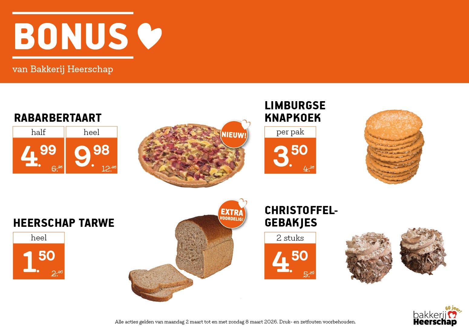 Geniet van versgebakken ambachtelijke broden, de heerlijkste vlaaien en seizoensgebonden producten. Zo vers en zo lekker, dat kiezen een kunst op zich is. De producten van Bakkerij Heerschap worden 365 dagen per jaar met liefde voor je gemaakt en dat proef je! Iedere week selecteren de bakkers nieuwe weekacties voor jou. Welke actie kies jij?