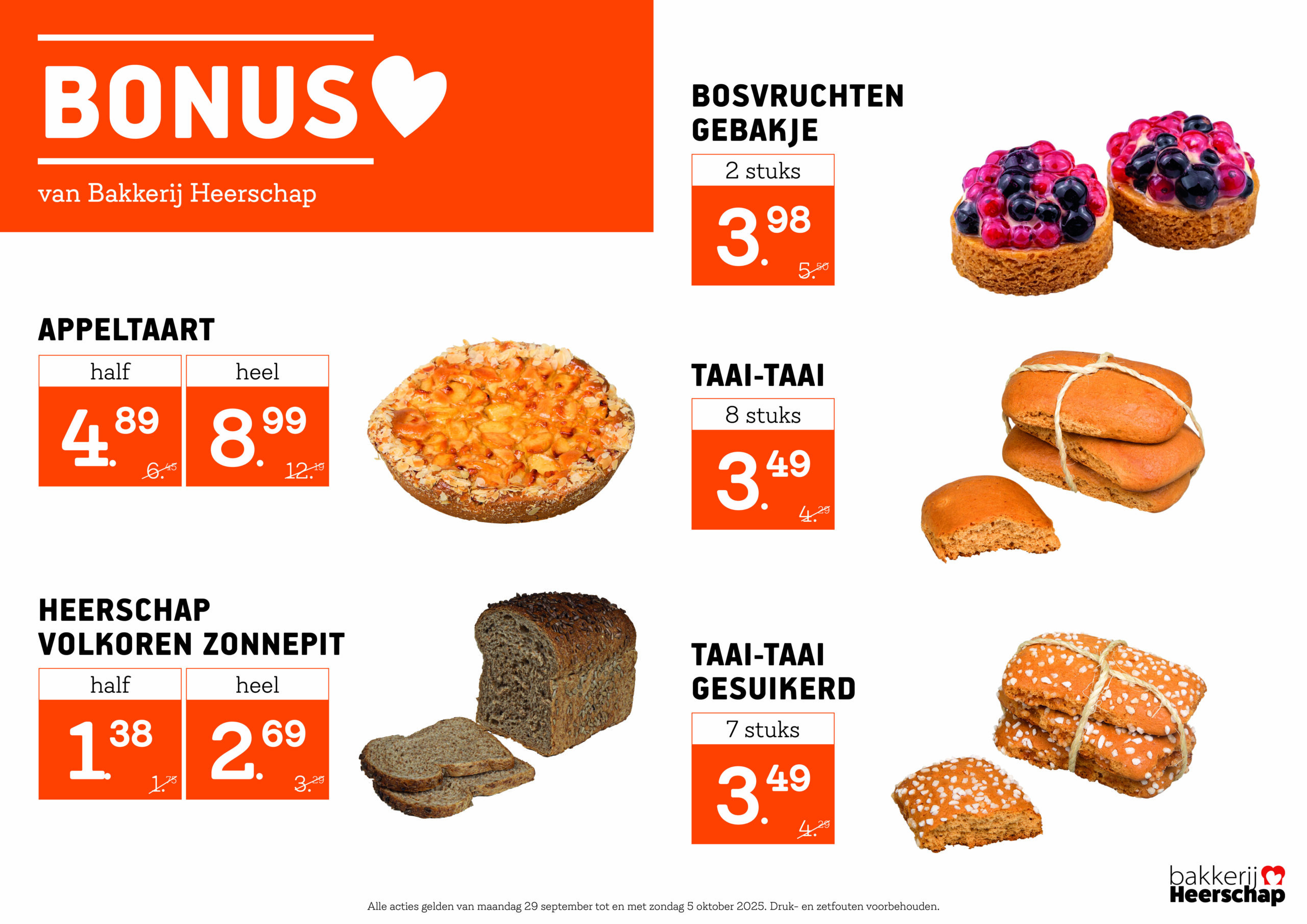 Geniet van versgebakken ambachtelijke broden, de heerlijkste vlaaien en seizoensgebonden producten. Zo vers en zo lekker, dat kiezen een kunst op zich is. De producten van Bakkerij Heerschap worden 365 dagen per jaar met liefde voor je gemaakt en dat proef je! Iedere week selecteren de bakkers nieuwe weekacties voor jou. Welke actie kies jij?