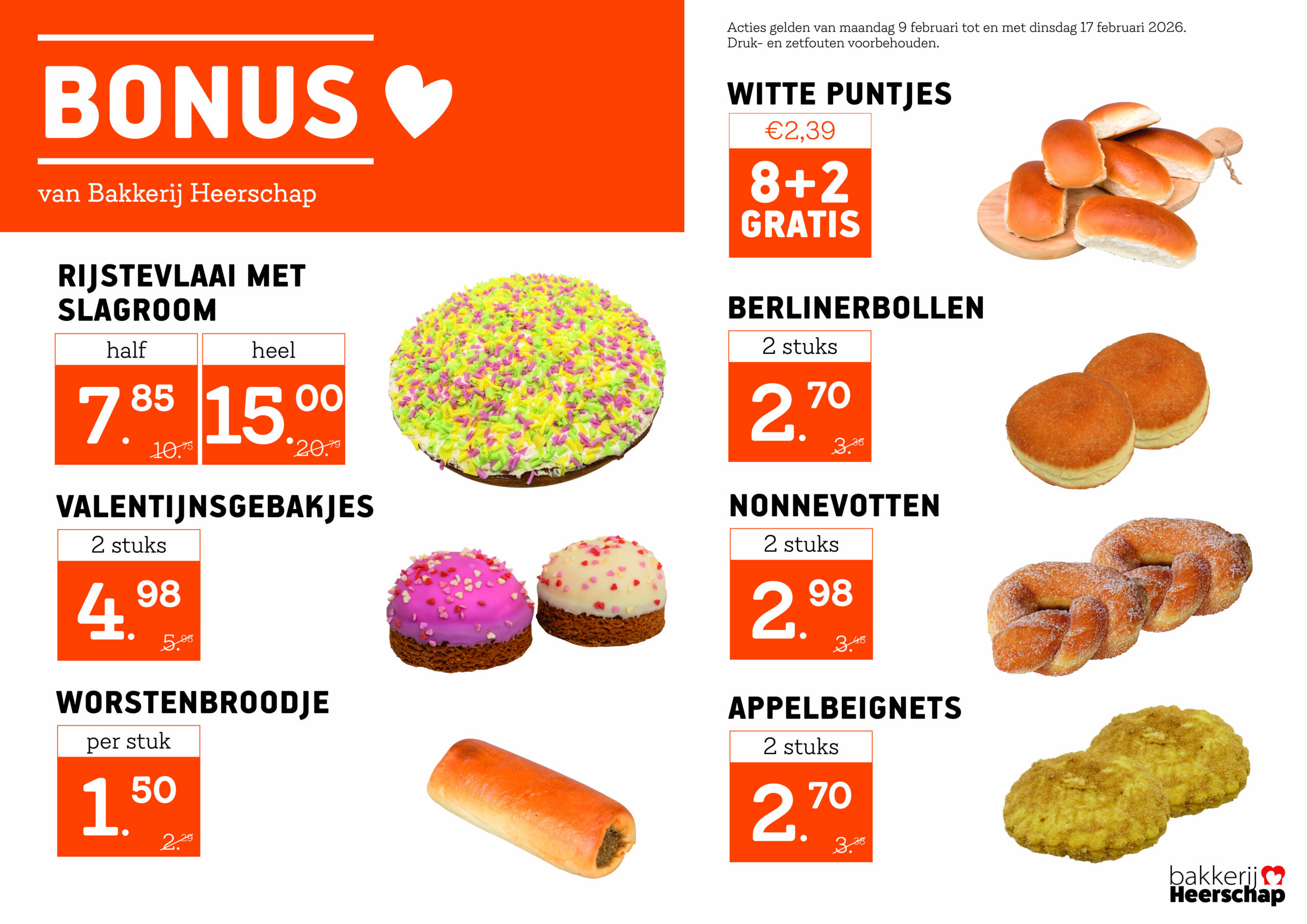 Geniet van versgebakken ambachtelijke broden, de heerlijkste vlaaien en seizoensgebonden producten. Zo vers en zo lekker, dat kiezen een kunst op zich is. De producten van Bakkerij Heerschap worden 365 dagen per jaar met liefde voor je gemaakt en dat proef je! Iedere week selecteren de bakkers nieuwe weekacties voor jou. Welke actie kies jij?