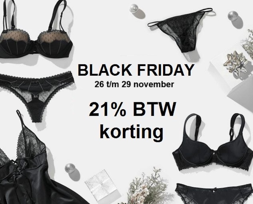 Woensdag 26 november t/m zaterdag 29 november Black Friday: 21% BTW korting op de gehele collectie! Met uitzondering van de Sloggi-actie.