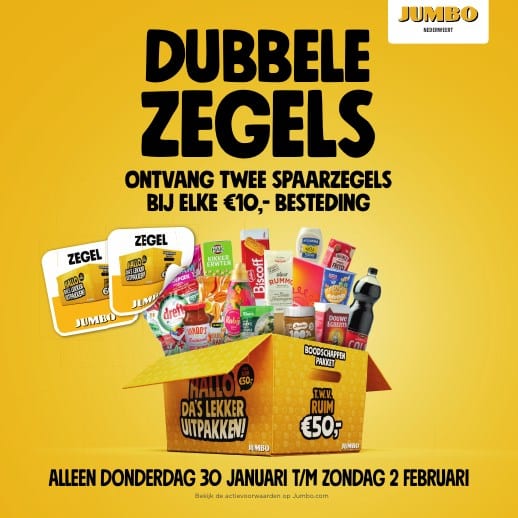 Dubbele zegels. Ontvang twee spaarzegels bij elke €10,- besteding. Alleen van donderdag 30 januari t/m zondag 2 februari.