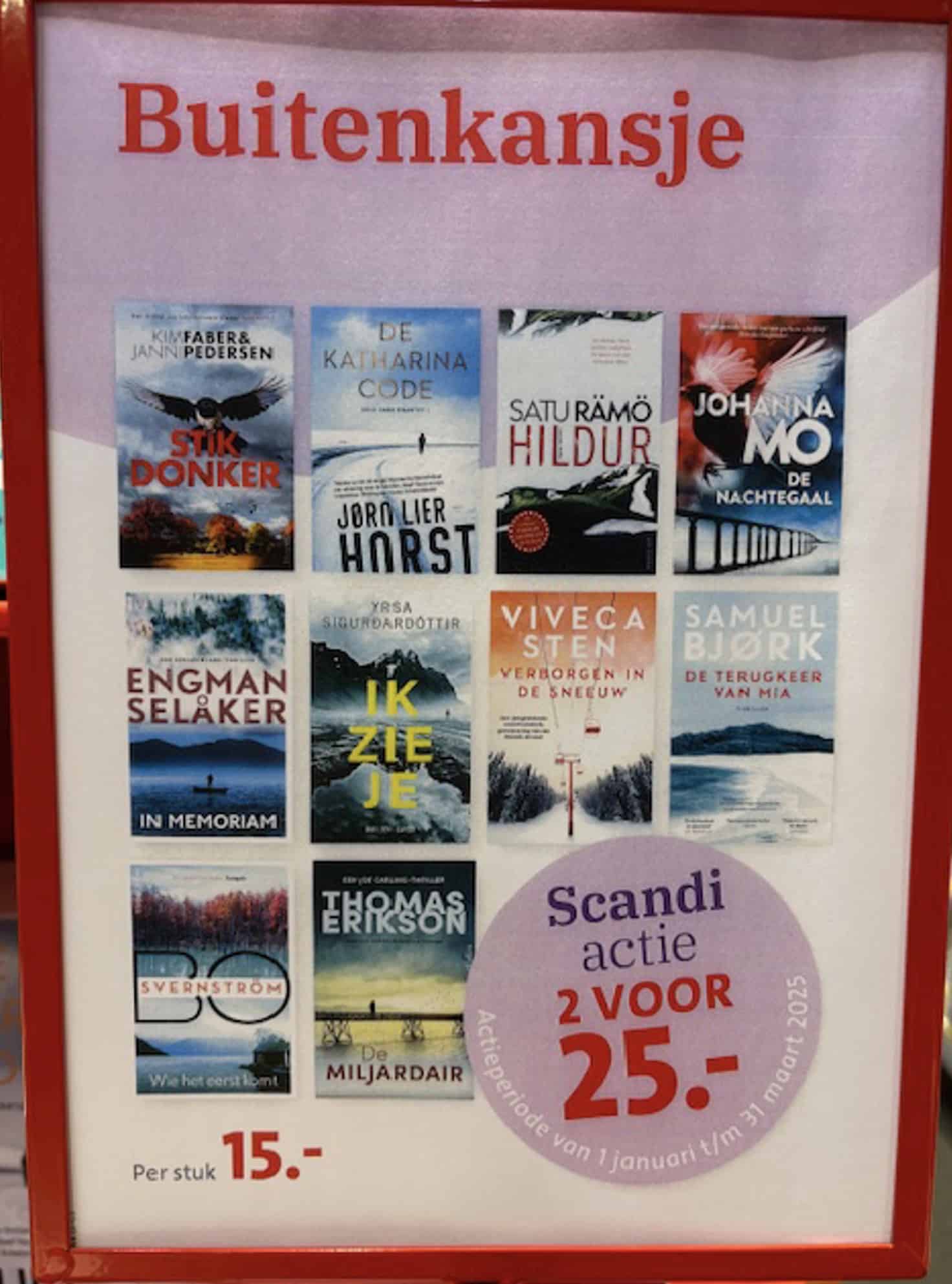 Met diverse uitgeverijen heeft Bruna een leuke Scandi thrilleractie opgezet. Tijdens de actieperiode zullen onderstaande boeken allemaal €15,- per stuk zijn en koop je er twee voor €25,-! Tien Scandinavische literaire thrillers doen mee en bezorgen jou gegarandeerd een winter vol kippenvel.