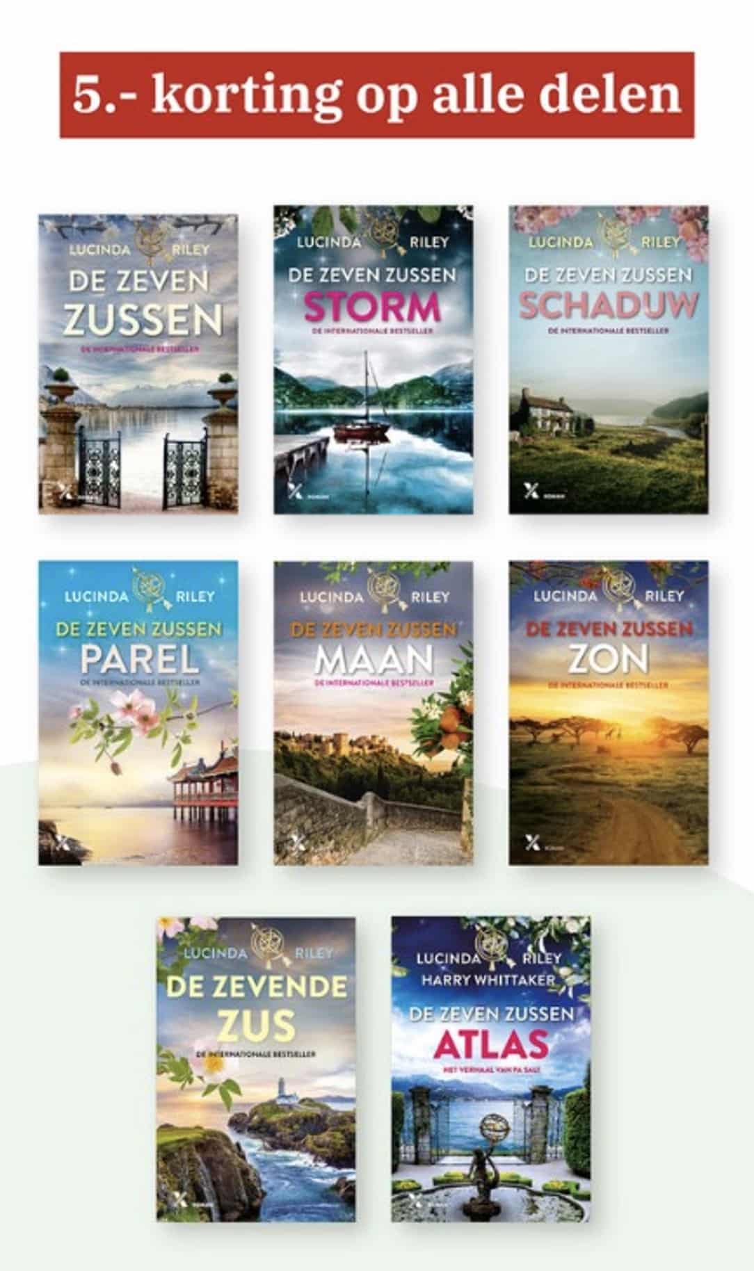 Tijdens de actieperiode (t/m 31 maart) koop je de paperback-delen van De Zeven Zussen met een korting van €5,-. Een mooie kans voor de liefhebbers van Lucinda Riley om deze achtdelige serie compleet te maken of om te beginnen aan deze prachtige reeks.