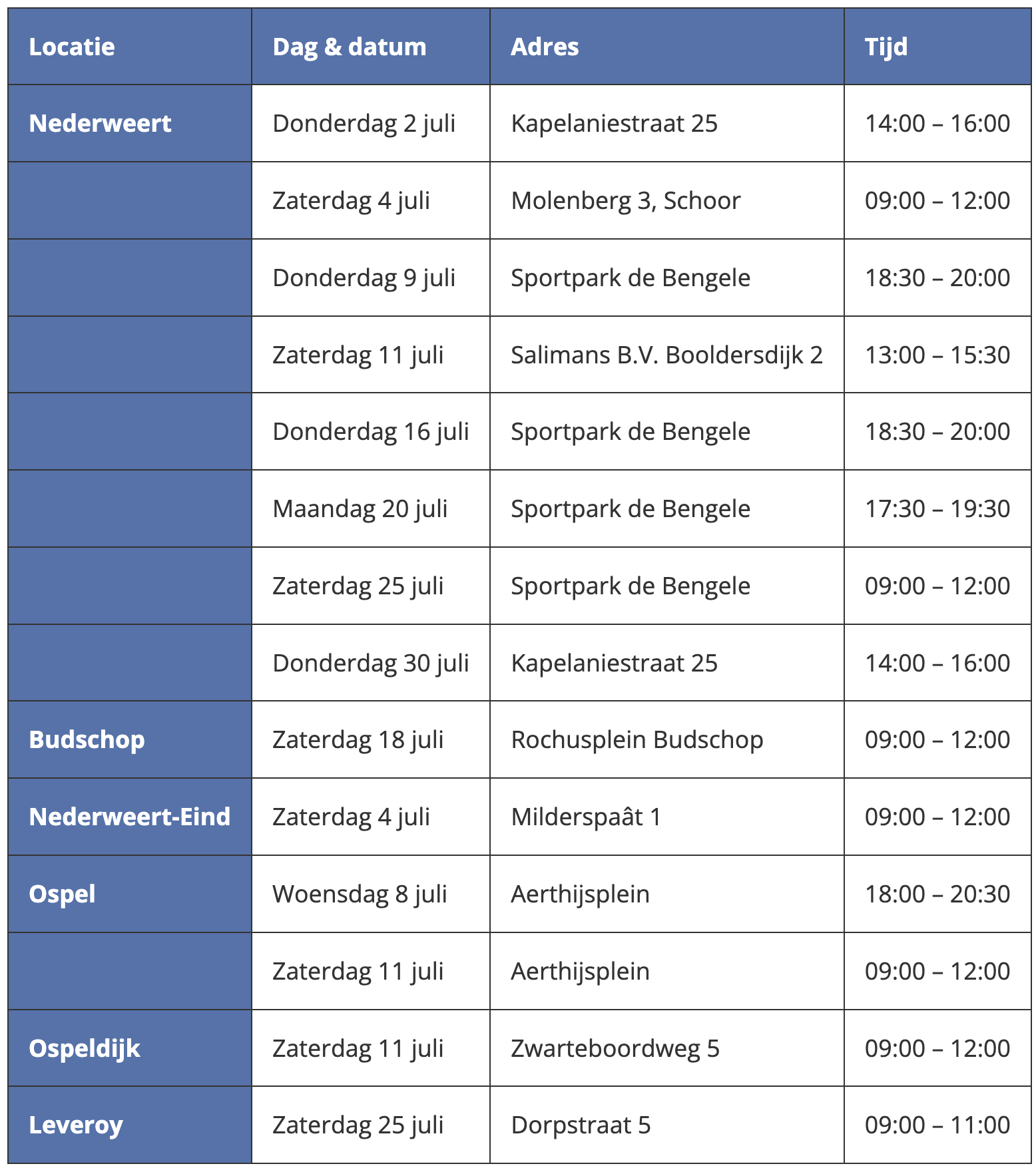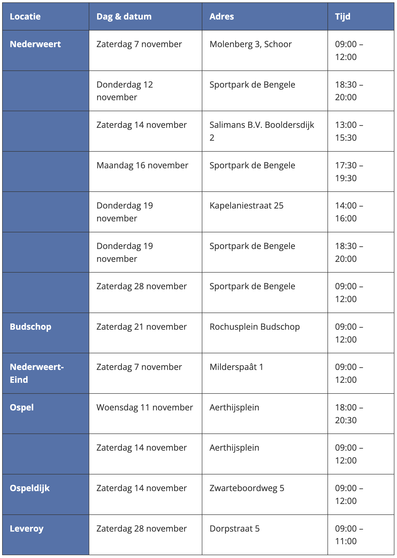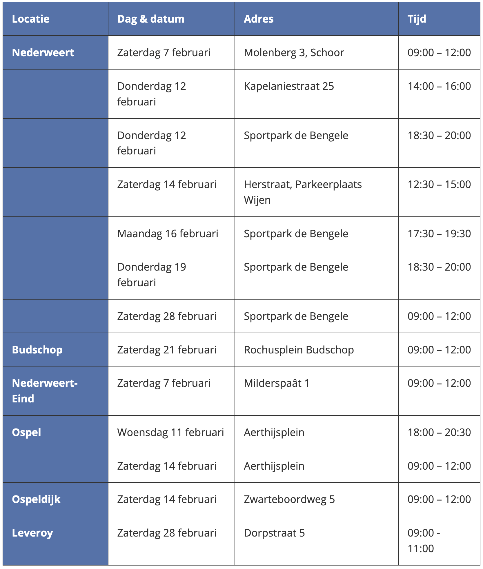 In onderstaande afbeeldingen zie je een overzicht van inzamellocaties, datums en tijdstippen voor het jaar 2026